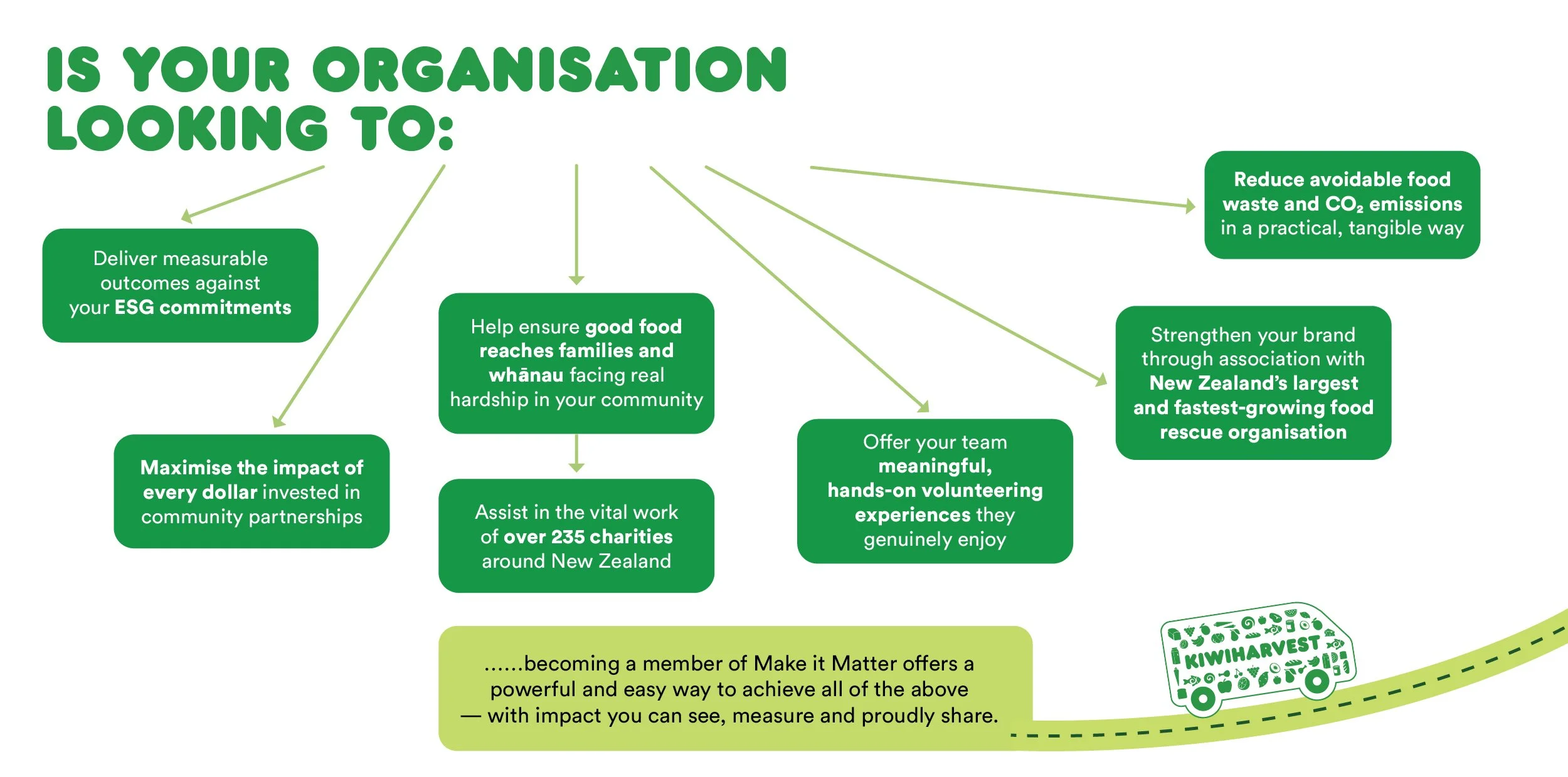 You can feature the KiwiHarvest Make it Matter brandmark on your website, social media, collateral and vehicles.